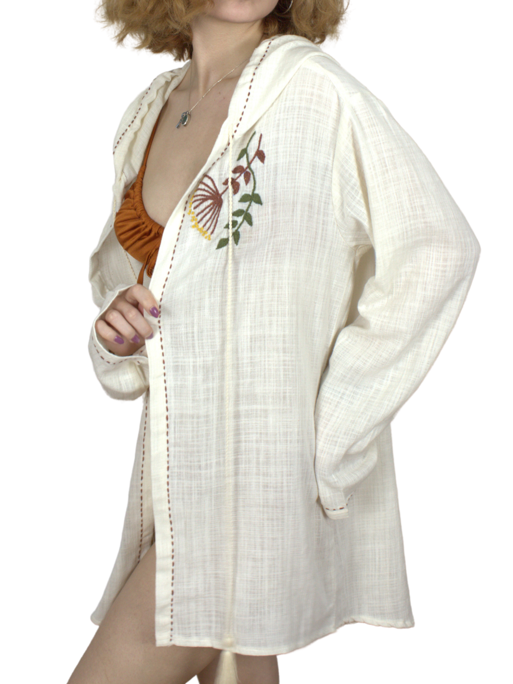 Kapüşon detayıyla fonksiyonel, el işçiliğiyle ruh taşıyan bu parça, gündelik şıklığı doğallıkla birleştirir. Sahilde yürüyüşten şehirde kahve molasına kadar her anında sana eşlik edecek bir sadelik sunar.